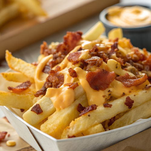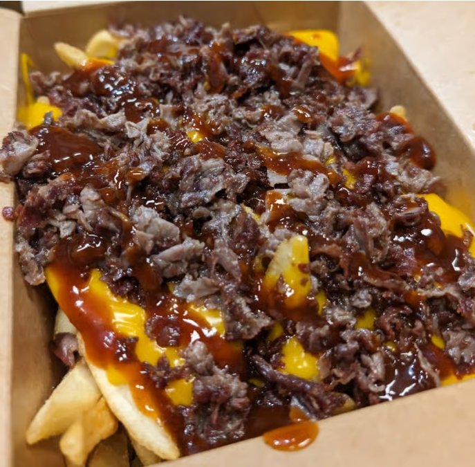 Tender, slow-cooked beef brisket piled high on crispy potatoes, smothered in smoky BBQ sauce and melted cheddar.