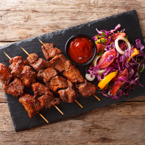 West African-spiced steak bites over crispy potatoes, garnished with suya sauce, onions, and fresh herbs.