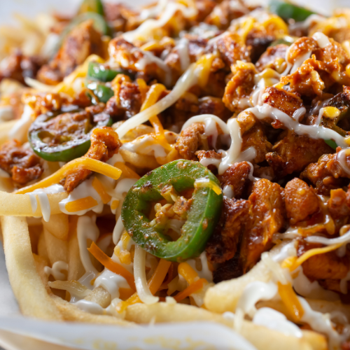 Crispy golden chicken bites, tossed in our secret spice blend, served over seasoned potato bites with creamy cheese sauce and a touch of ranch.