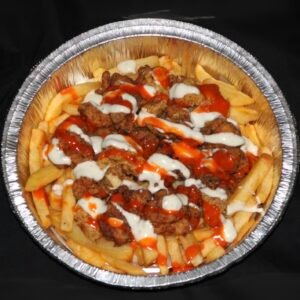 Grilled steak strips on garlic-herb potatoes, topped with pico de gallo, chipotle crema, and shredded cheese.